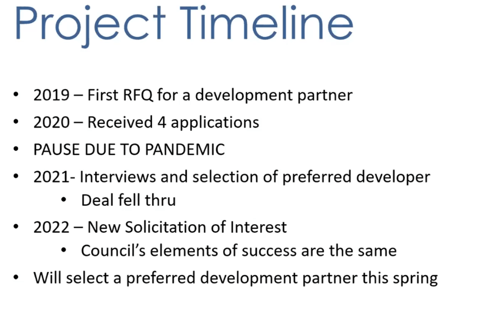Larry Dzieza then said that maybe the city is acting out of sequence and could miss a great opportunity by picking a developer before having the study done that would help meet what the public and the council say they would like to see happen. He said that truly affordable housing for 99 years will add a lot more value than kind-of-affordable housing for 15 or 20 years. Larry said that is more bang for our bucks and it would pay to wait.