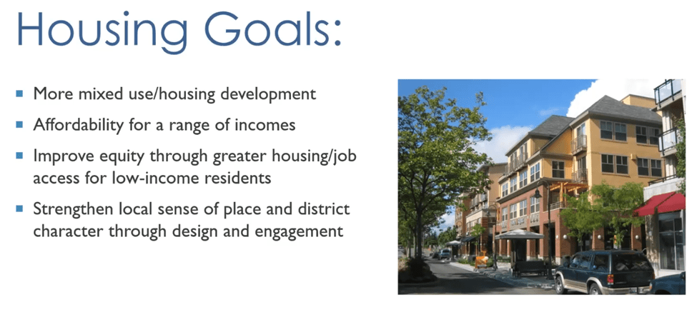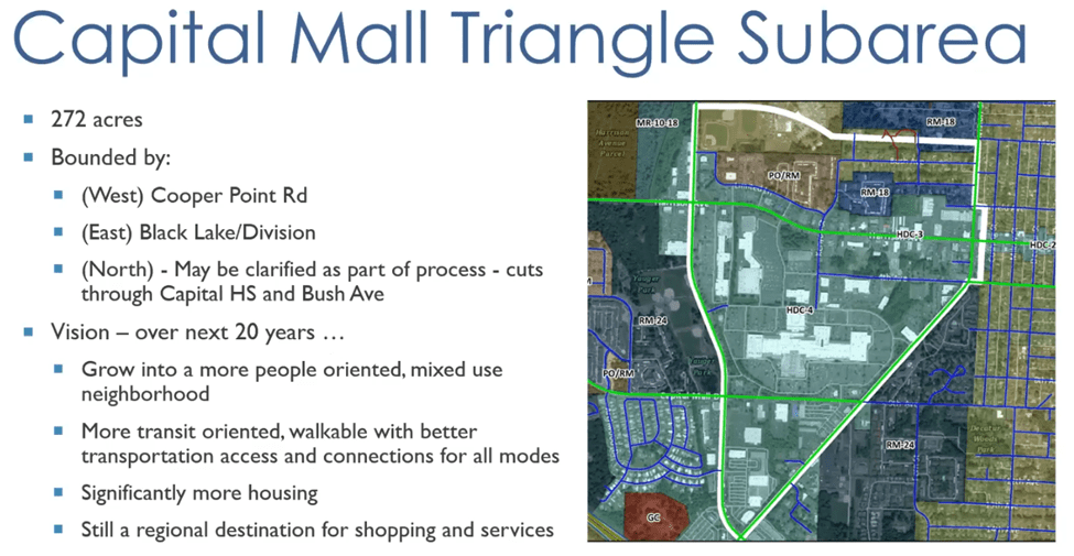Amy presented the need for a subarea plan for the Capital Mall Triangle, a project area which is called for in the housing action plan. The city of received a $250,000 grant from the Department of Commerce for this work. The focus of the grant is to encourage transit-oriented development which means compact mixed use communities and new transit where people can enjoy easy access to jobs and services.