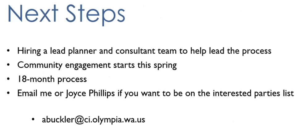 If CNA members are interested they can become an “interested party” and be informed about the project by contacting abuckler@ci.olympia.wa.us.