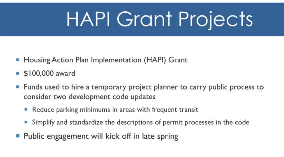 Amy reported that the city received another $100,000 grant for housing action plan implementation (HAPI). We are using those funds to hire a temporary project planner to carry out two processes. One is development code updates about reducing parking minimums with areas with frequent transit and the other to simplify and standardize the descriptions of our permit processes in the code.