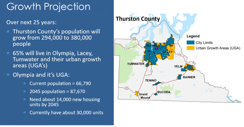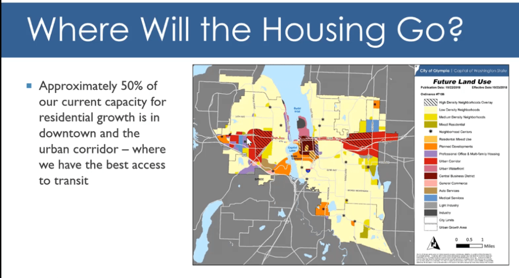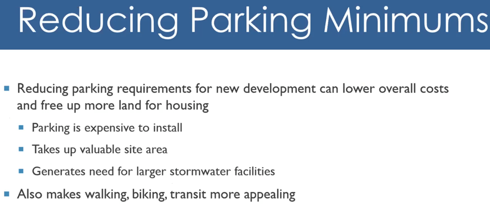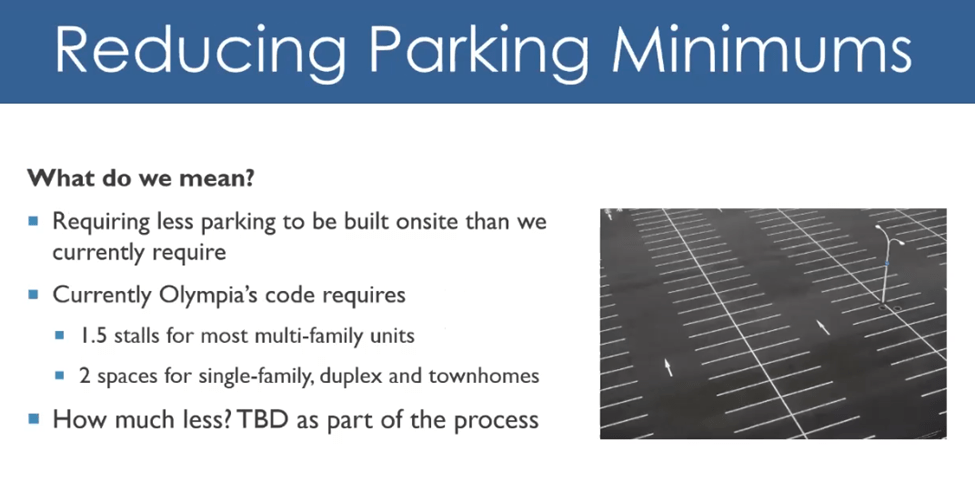 We could be requiring less parking to be built on site than we currently require. Currently Olympia development code requires 1 1/2 stalls for most multifamily units and two spaces for things like single family, duplex and townhomes. Reducing parking requirements has been shown to help incentivize more housing development and reduce housing costs. How low we go we don’t know, that’s part of the study.
