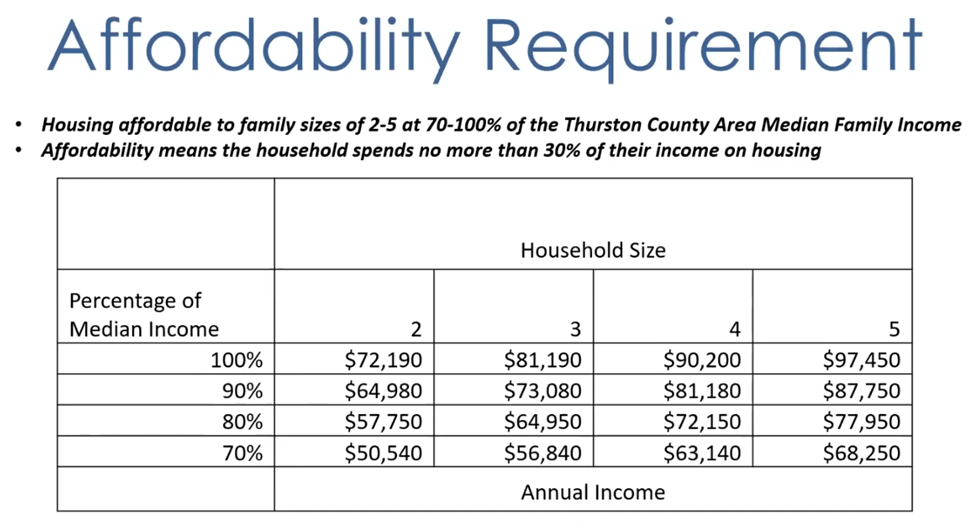 Judy Bardin raised the issue of the income limits the city is using to define low-income at 80% of Area Median Income when 40% – 50% of Olympians are making less than $50,000 which is lower than what the city is calling low-income. Legislation being proposed in the state is using 60% of AMI. Judy wondered why the city is sticking with 80% when it won’t reach a lot of people who live here.
